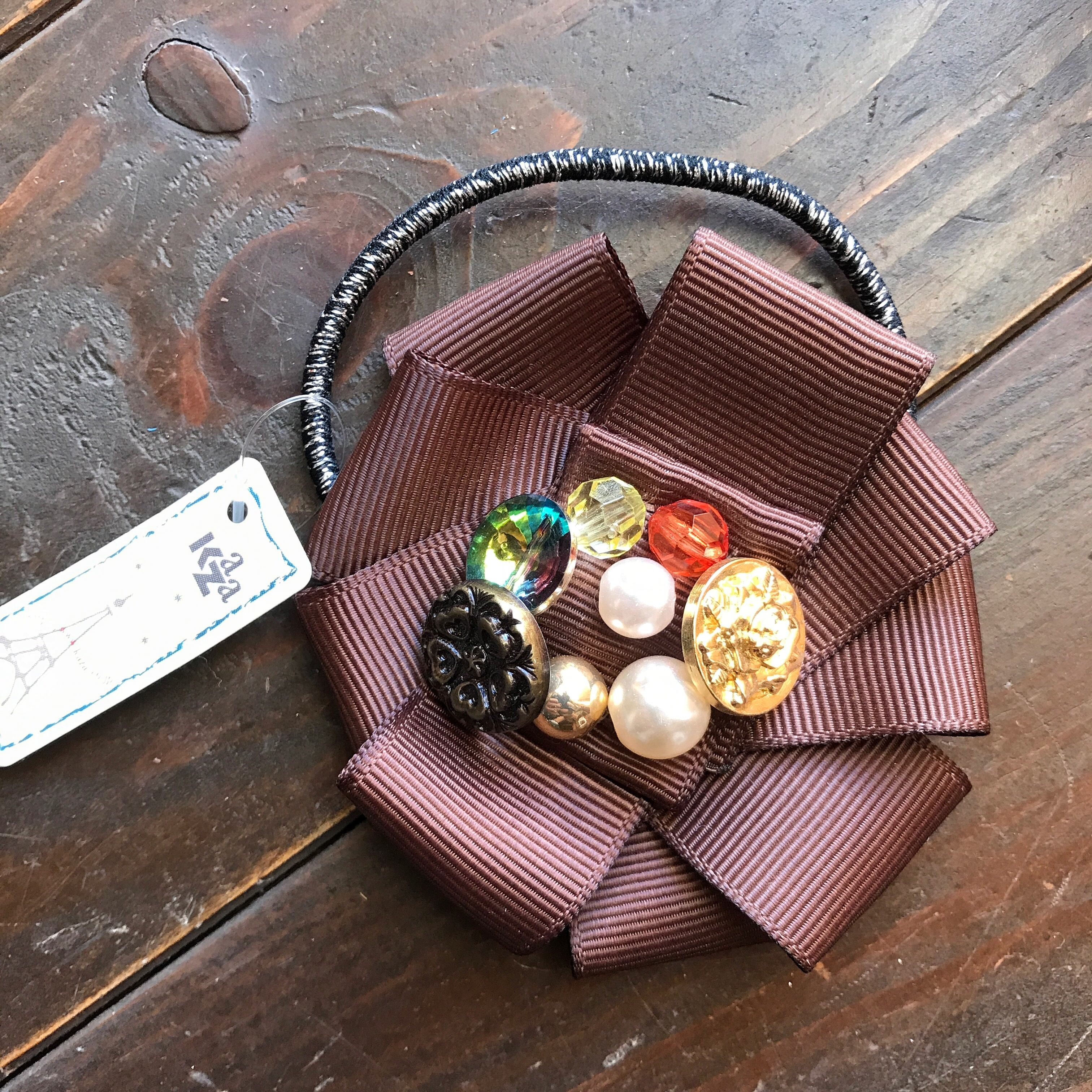リボンを折り込み、ビーズをあしらった大人っぽいヘアゴム。