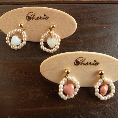 アクセサリーブランド・CHERIEのピアス。 ハートのパーツの周りをサークル状にパールビーズで囲んであります。 女性らしい優しいデザイン。