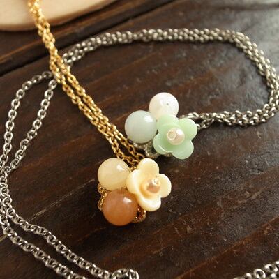 アクセサリーブランド・CHERIEのネックレス。 グラスビーズの花とパールビーズを組み合わせ、小さな花束をイメージ。 すっきりとした印象のネックレス。